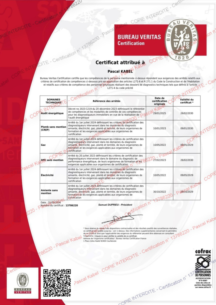 Diagnostiqueur immobilier certifié par Bureau Veritas, notre professionnel dispose des compétences requises et intervient dans le respect de la réglementation en vigueur.